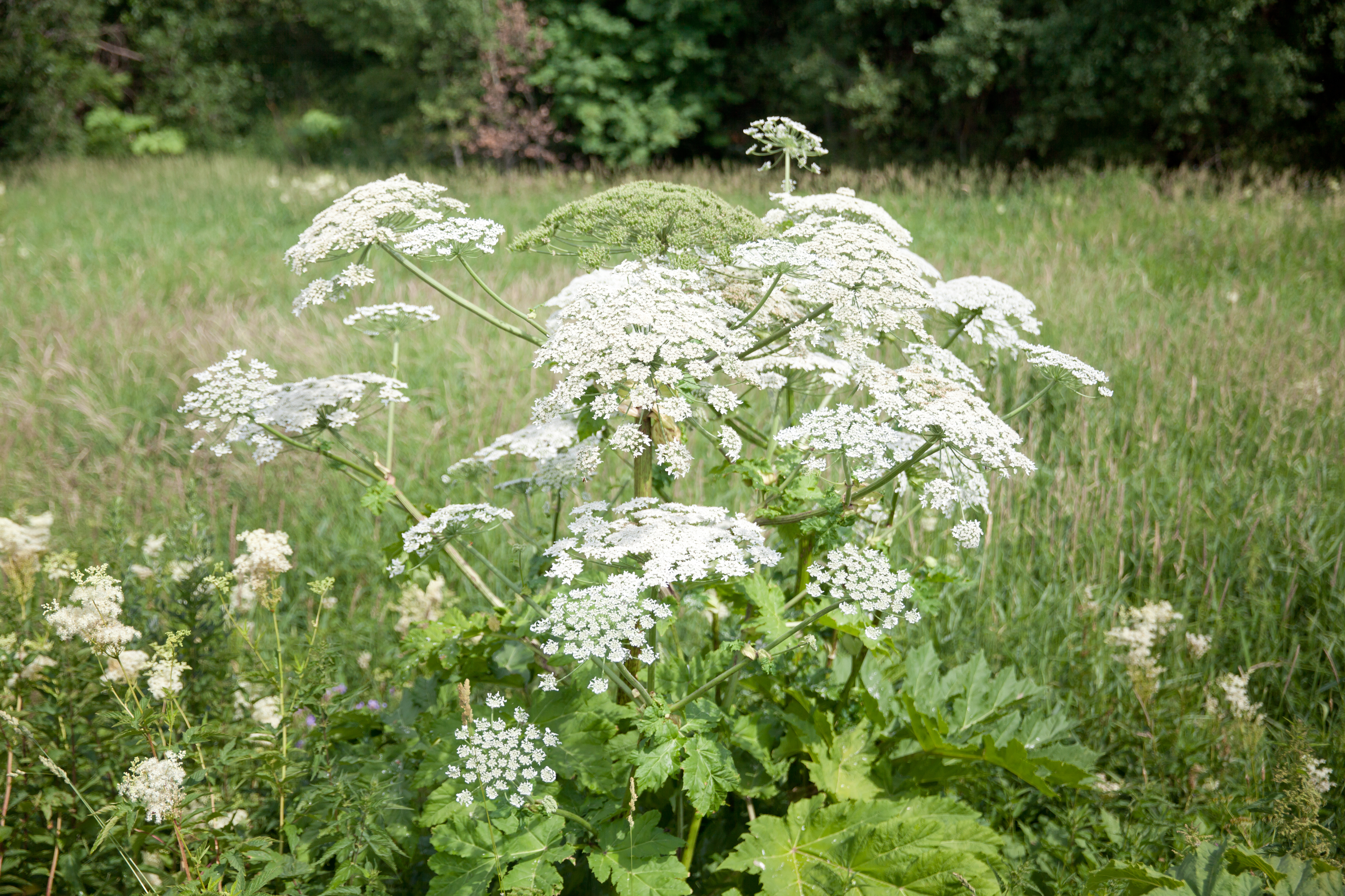 Mature giant hogweed plants produce large, white umbrella-shaped flower clusters.